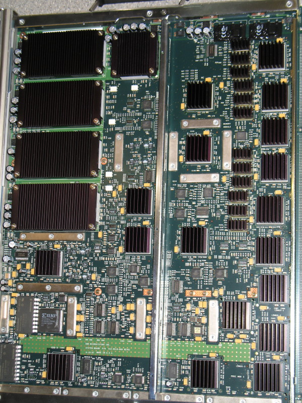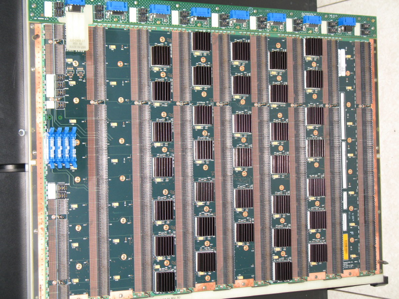 On the right and on the bottom you see the 18 ASICs with their heat sinks used for system interconnection, i.e. address and data
